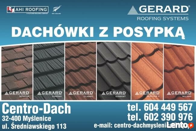 W ofercie posiadam dachówki ceramiczno metalowe firmy Gerard Ahi Roofing (wszystkie wzory i kolory) oraz akcesoria do tych dachówek. Zapewniam bardzo atrakcyjne ceny. W ofercie również blachy dachowe, dachówki ceramiczne, systemy rynnowe, okna dachowe, wyłazy oraz wszystkie pozostałe akcesoria dachowe.Centro-Dach Myślenice,