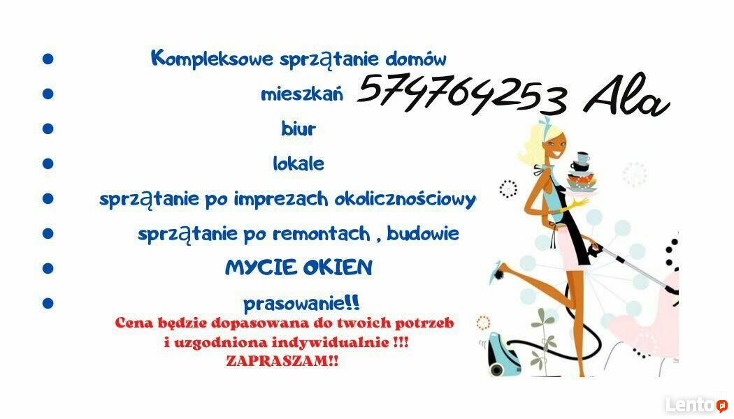 Witam ! Oferuję usługi sprzątania mieszkania, domu, lokale ,salony kosmetyczne , siłowni , biur ,klatek schodowych w budynkach mieskanowych ,gabinetów , Sprzatanie PO REMONTACH I BUDOWIE ,piwnicy i innych pomieszczeń, kompleksowo, tanio, a co najważniejsze solidnie i dokładnie. Możliwe jest indywidualne ustalenie zakresu prac porządkowych (wybrane pomieszczenia i określone czynności) oraz przyjęcie zlecenia stałego - wtedy cena będzie ustalona indywidualnie.Cena usługi zależna jest od charakteru sprzątania oraz metrażu. Zapłata za całość, zawsze po wykonaniu pracy.